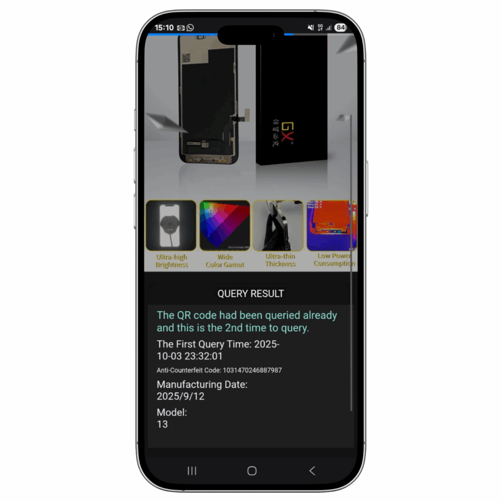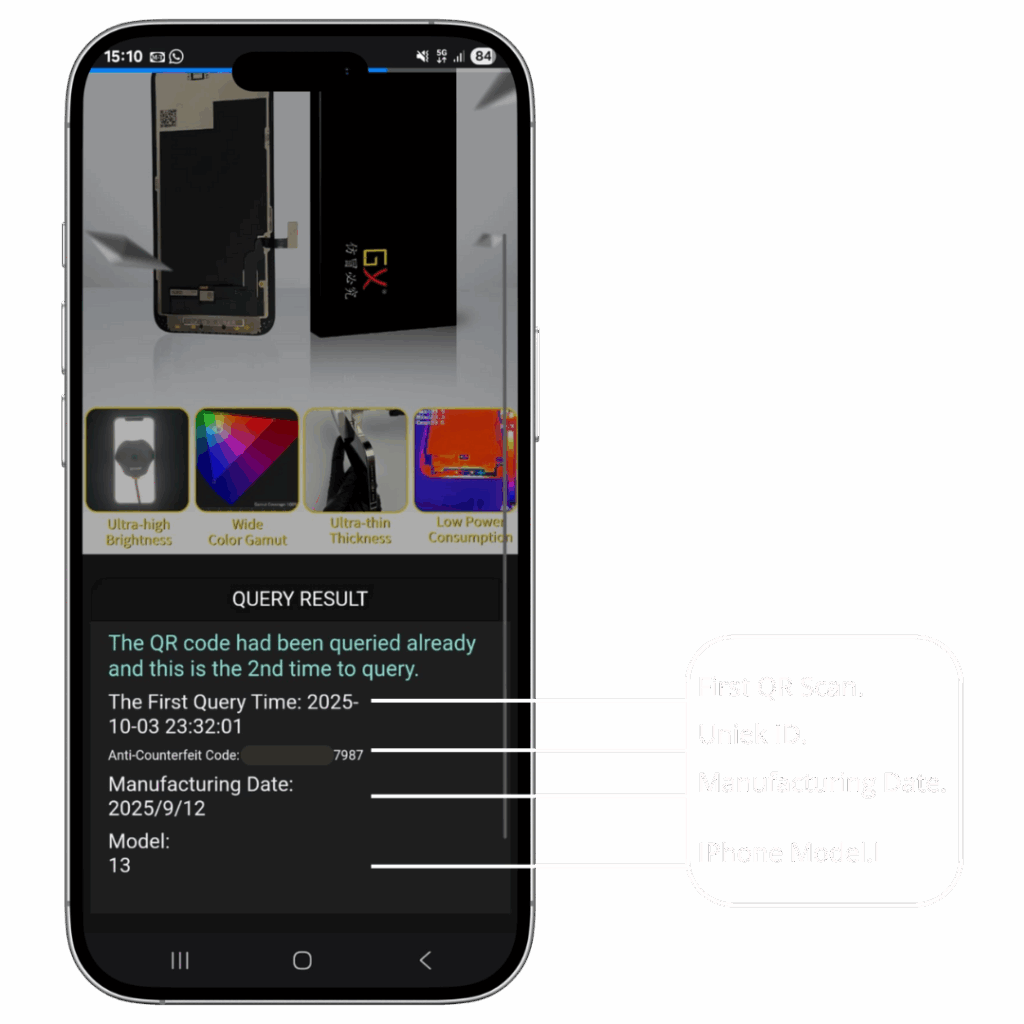 If there is a QR code, simply scan it using your phone’s camera. You will be redirected to a unique verification page where you can see your LCD’s ID, the production date, and the date of your scan. This page will also confirm whether your screen is an authentic GX LCD.