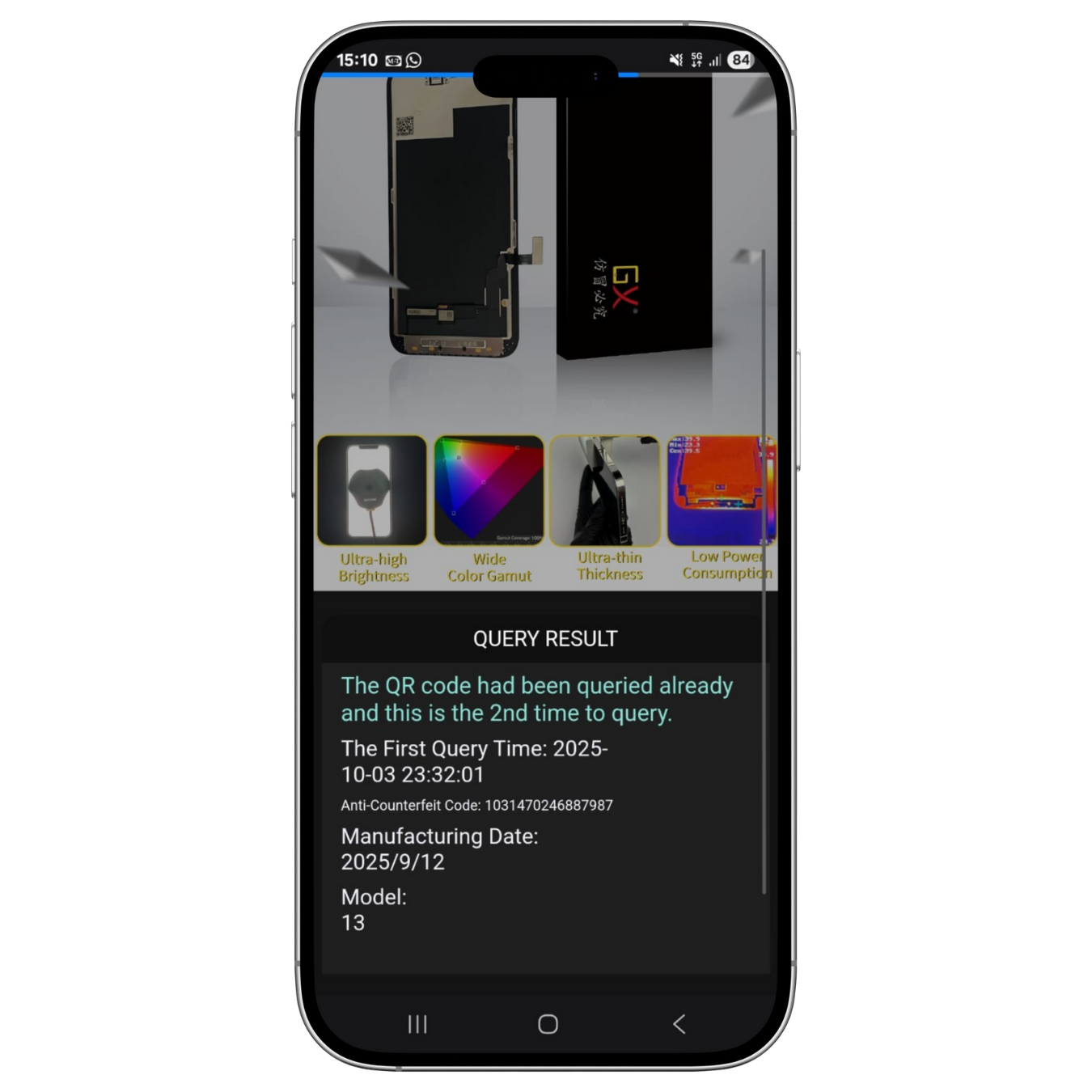 If there is a QR code, simply scan it using your phone’s camera. You will be redirected to a unique verification page where you can see your LCD’s ID, the production date, and the date of your scan. This page will also confirm whether your screen is an authentic GX LCD.